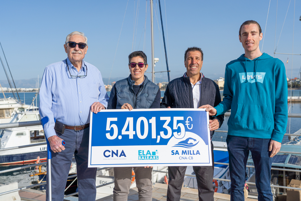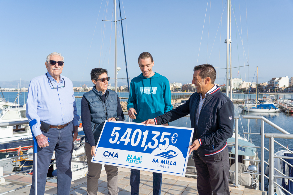 S’Arenal, 15 de noviembre. El Club Nàutic S’Arenal (CNA) ha hecho entrega hoy a los representantes de la asociación ELA Balears de la recaudación económica de las inscripciones de la Travesía Sa Milla CNA - Cala Blava, emblemática prueba de natación en aguas abiertas que este año celebró su vigésimo primera edición se celebró el pasado verano en el marco del 60º Gran Día de la Vela - Bufete Frau.
